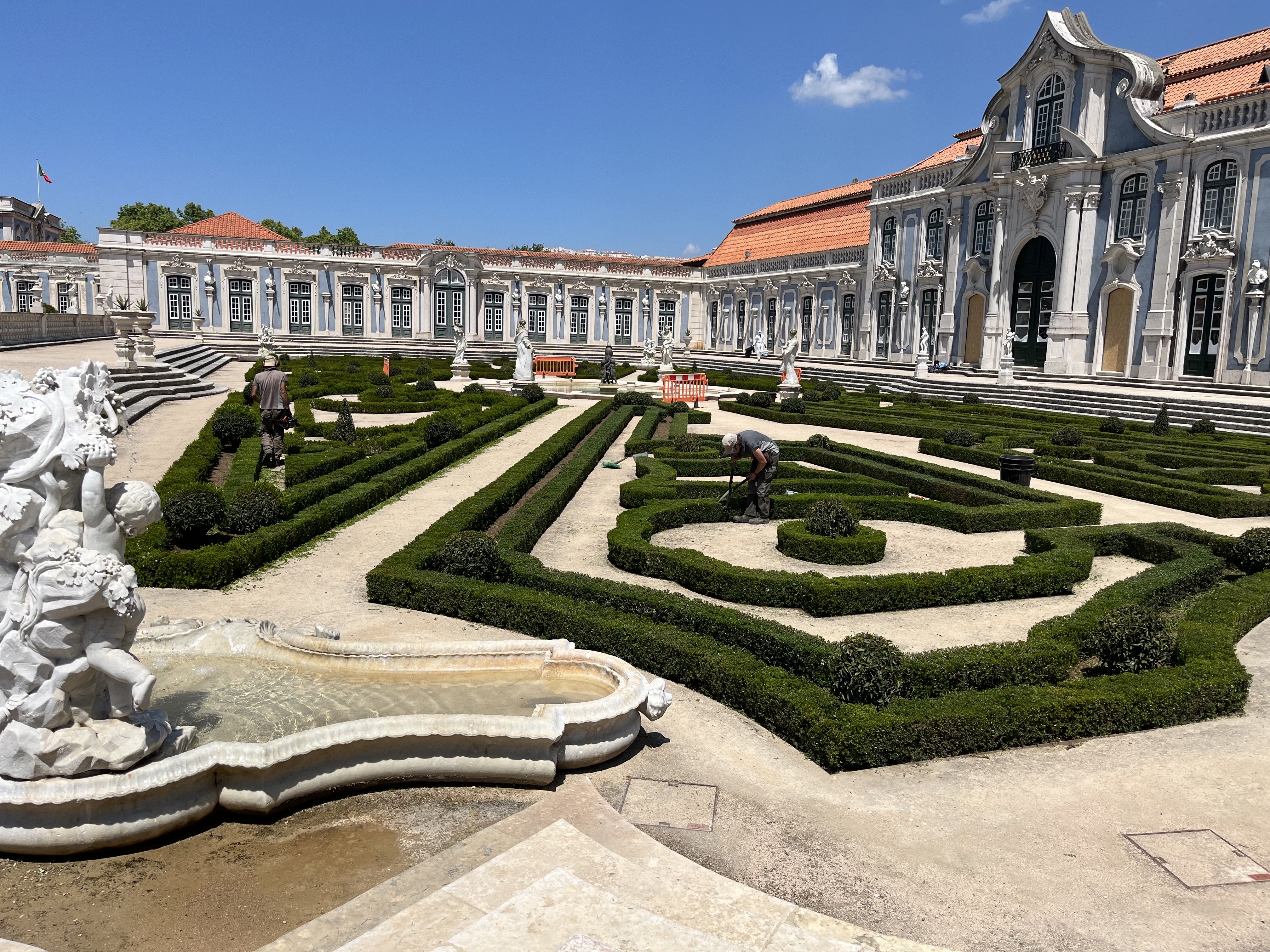 From there we headed off to the palace of Queluz, a magnificent summer and then year-round home for the House of Braganza, the ruling family of Portugal and Brazil. Agnes taught us the history of royalty that affected both countries, ending up with neither having a royal family. Brazil became independent in 1822; Portugal's monarchy was abolished in 1910. King Pedro, the monarch early in the 19th century, died in this palace after abdicating the role of Emperor of Brazil. The building, with its music rooms, its gold covered stucco interior and a garden modeled in the same style of Versailles, is not well-visited but fascinating. It saves us from the crowds at Sintra, a nearby palace that is overwhelmed, and which we visited in 1983. At the palace, our guide, Marco, provided us with a treat--the Portuguese egg custard pastry. These were magnificent and we enjoyed them as the pastry flaked. We were careful to leave no crumbs in the palace entryway.